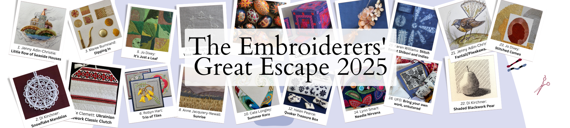 Jenny Adin-Christie: Jenny is a professional hand embroidery artist, designer and tutor, celebrated around the world for her unique slant on traditional hand embroidery, for her innovative designs and inspirational teaching, specialising in metal thread work, raised work and fine whitework.