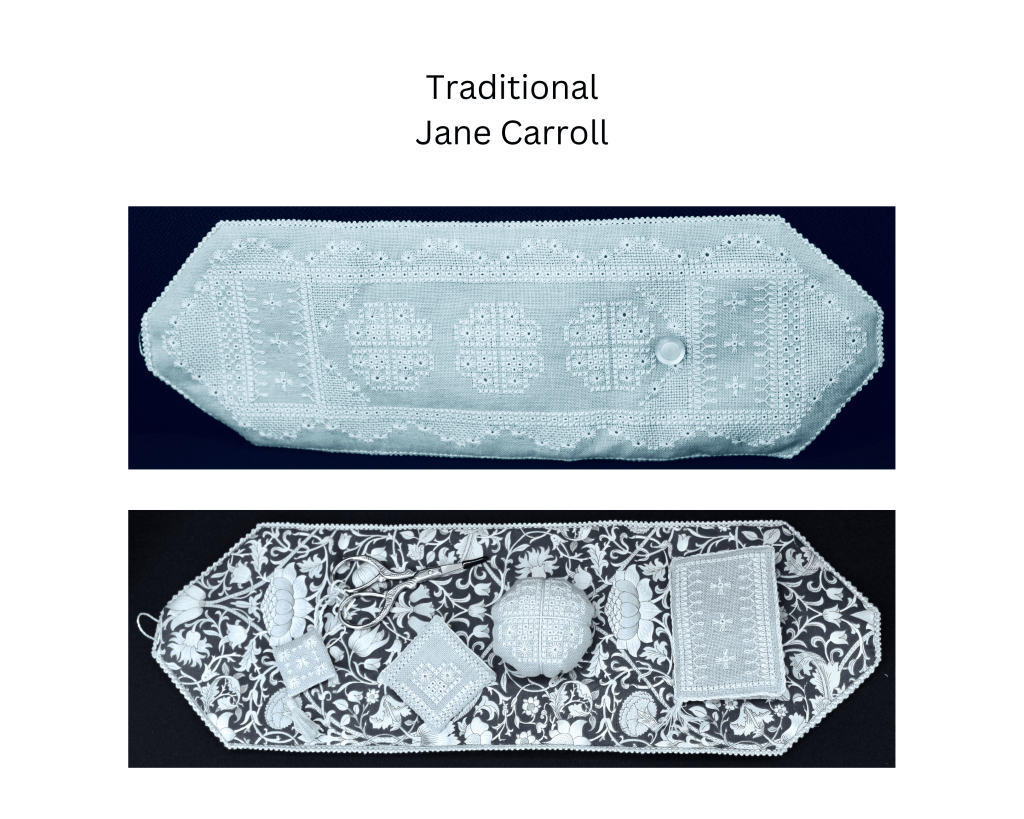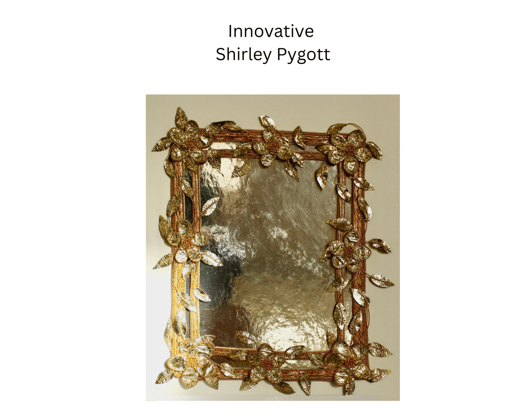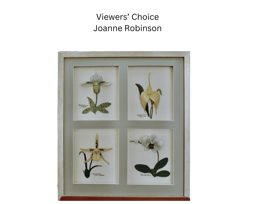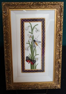 This stunning Stumpwork piece is a Jane Nicholas design called “Snowdrops and Cranefly” and is beautifully stitched by Carolyn B from the Needleworkers group in the Hawkes Bay. The framing sets it off beautifully.